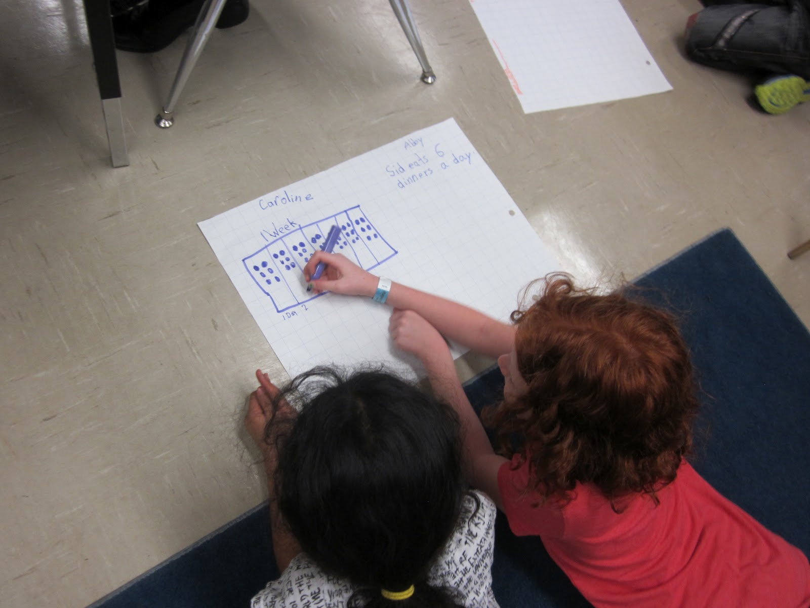 In math, the class focused on the proper way to answer a math word problem. The steps to remember are: draw a picture, write a number sentence, write a word sentence and consider if the answer makes sense. The children worked in groups and partners to experience how different students approach solving a problem. Then each student tried using the learned strategies to solve problems alone. The students were also introduced to the concept of codes and how one-to-one object mapping help them crack a code. The class also looked at the concept of 1000, in terms of place value and how relatively big the number is (ten groups of 100).